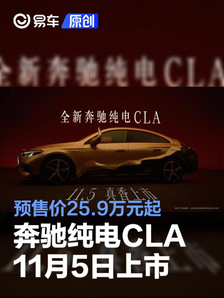 易车讯我们从官方获悉,奔驰全新纯电CLA将于11月5日迎来正式上市。新车于9月25日开启预售,包含两款车型,预售价区间25.9-29.9万元。